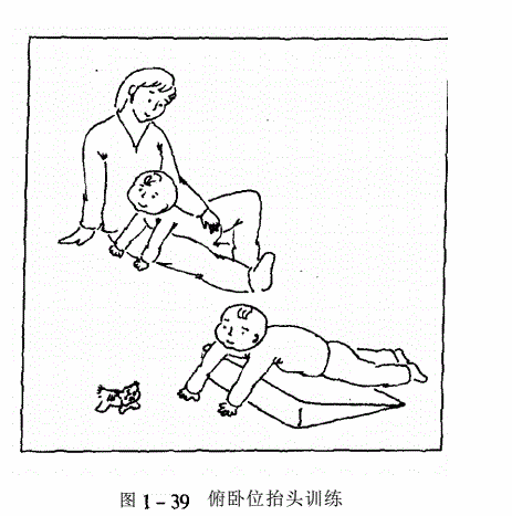 俯卧位或仰卧位可促进头的抬起和移动,增强肩胛带、髋关节的控制,提高背肌的肌力,也容易纠正非对称性姿势,还可以促进翻身(参见图1- 39)。
