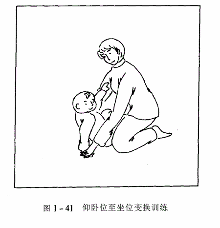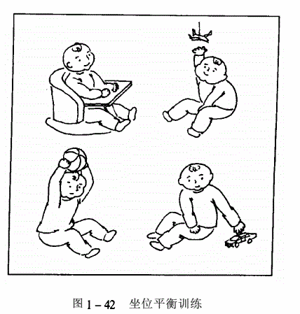 练习坐位应先练习头直立位控制。坐位时手功能训练和坐位平衡训练能相互加强另一方的发育(参见图1-42).