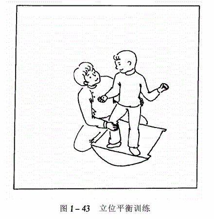 应鼓励在注意矫正异常姿势的情况下,用站立架和支具进行时期负重站立。在行走之前需进行各个方面上两足间的体重转移训练,以获得较好的头、躯干姿势反应,而在此之前,应进行早期运动能力的训练。否则,就会产生异常步态(参见图1-43)