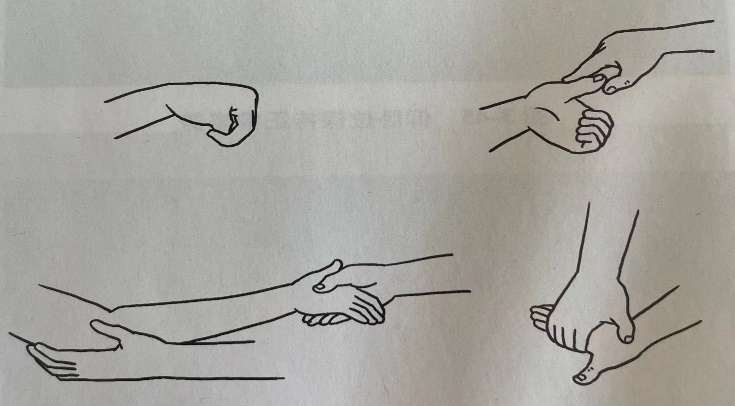 1、手的抓握:拇指内收—尺侧握,手指过度屈曲时。