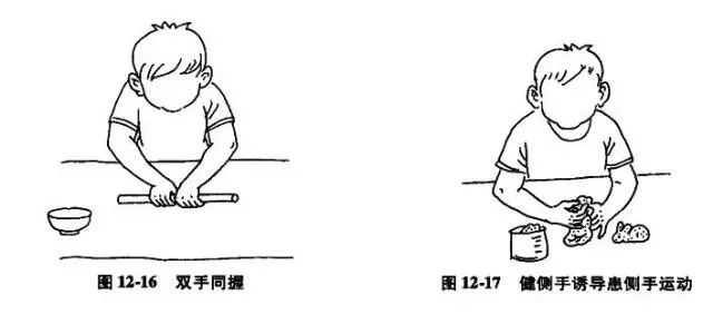 此游戏可促进患侧的分离运动,通过反复的类似运动,可防止肌紧张的增强,同时用健侧手带动患侧手的运动(图12-16,图12-17).