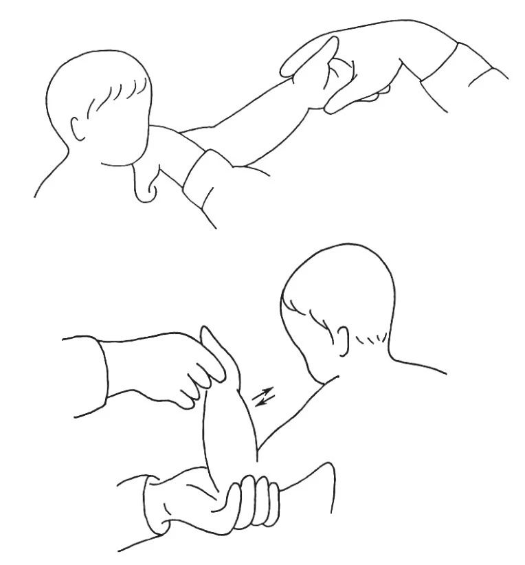 上肢可将手臂抬高,伸直向外转,并将拳头张开。若肘部弯曲很厉害,可以利用手臂伸直,用手将患儿的手掌平放,腕部向上屈,使手活动,并将腕、肘、手一起伸直。见图8-28。