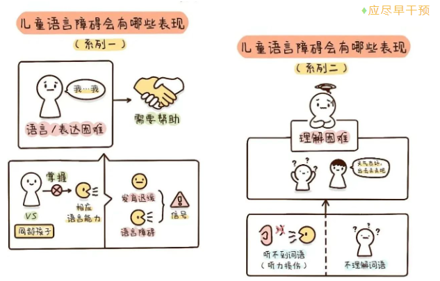 可表现为语言理解能力差,不能遵循指令,词汇量少,句子简单,不能进行与年龄相称的语言表达等。