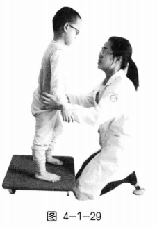 孩子双脚站立于平衡板上,治疗师双手扶持其髋部,帮助其身体慢慢左右摇动,使双下肢交替伸展、屈曲(图4-1-29)。