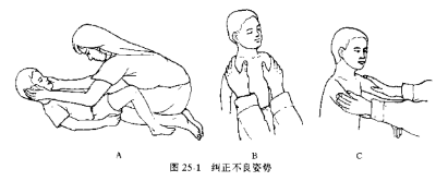 表现为头向后仰,双肩旋前上抬。纠正时用手压着患儿的双肩,并扶其头部向前倾(图25-1A)。不要将手放在患儿的枕后部向上抬,以免加重痉挛。