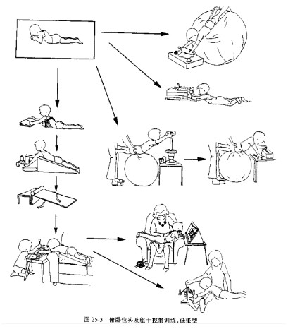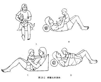 如果患儿学不会抬头则其他活动将很难学会。仰卧位由于紧张性迷路反射的影响,使背部肌张力增加,身体僵硬,而正坐位有助于患儿抬头和注视四周。