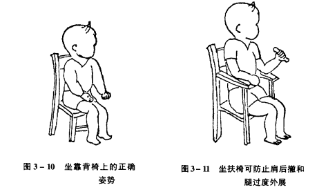 (5)患儿可坐在有靠背椅子上,腰挺直,椅子高度以双足全部着地为标准,髋、膝、踝关节均屈曲90°,头部保持立直(图3- 10)。