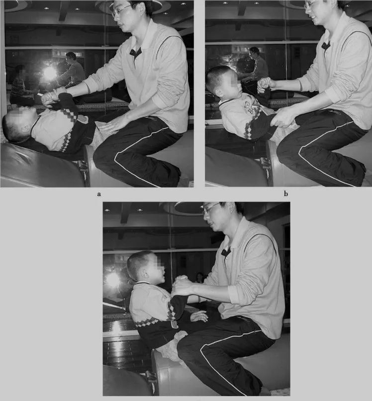 患儿仰卧位,治疗师坐于患儿下肢处,使患儿的两下肢伸展并分开,用自己的下肢予以固定。治疗师两手牵拉患儿的双手,将其向坐位拉起,可达到增加腹直肌和腹内、外斜肌肌力的目的,可以反复操作数次。如果患儿有能力,可以让患儿依靠自己的力量从仰卧位坐起。