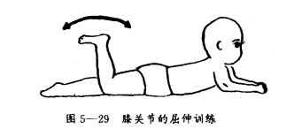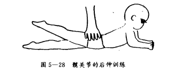 髋关节的后伸训练是让患儿在俯卧位将下肢伸直,腿上抬,训练时注意不要让患儿的臀部向上翘起。如图5-28所示。如果患儿自己不能完成后伸动作,训练者可以用一只手在患儿的臀部进行固定,另一只手可以在患儿上抬下肢的膝关节下给予向上的帮助,让患儿逐渐学会这一动作。
