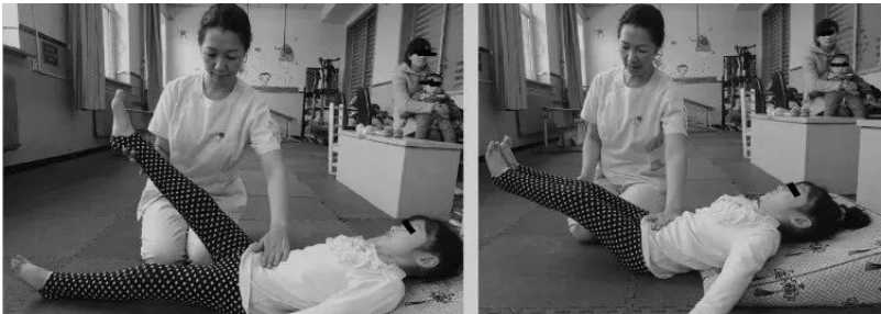 患儿仰卧位,治疗师坐于其体侧。口头吩咐患儿抬起一侧下肢,如果自己进行有困难,治疗师可以给予相应的协助,如果有可能,最好是将下肢举至与躯干呈直角的程度。应反复进行,需要两侧同时或者两侧交替进行(图1)。也可以进行同时上举双侧下肢的训练(图2)。