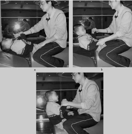 患儿仰卧位,治疗师坐于患儿下肢处,使患儿的两下肢伸展并分开,用自己的下肢予以固定。治疗师两手牵拉患儿的双手,将其向坐位拉起,可达到增加腹直肌和腹内、外斜肌肌力的目的,可以反复操作数次。如果患儿有能力,可以让患儿依靠自己的力量从仰卧位坐起。