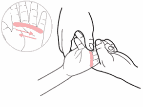 对于长期握在一起,不能伸开的手:训练员的手按住患儿的内关穴,用语言诱导患儿抓住或按住患儿的外关穴,使患儿的手指张开,慢慢地把患儿的手指分开。