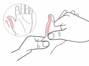 在训练过程中,可先把患儿其余四指握住,再诱导拇指外展,并反复做增加信息反馈。训练员亦可用自己的拇指,平推“伸指穴”及 按揉“合谷穴”之后,用牵拉法用力拉伸患儿的拇指,并做上、下摆动 。