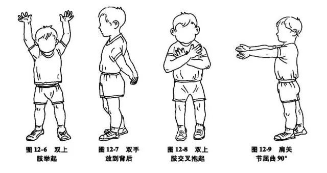 小手小手拍,拍,拍,请把小手举起来(先拍手,然后双上肢举起。双肩关节屈曲180度,肘关节,腕关节伸直,手张开)。