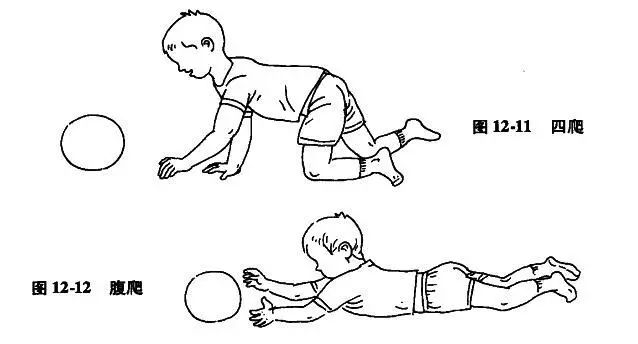 目的:提高四爬,腹爬,高爬,三点支撑能力,可提高患儿树立信心,意志控制及解决问题的能力(图12-11,图12-12)。