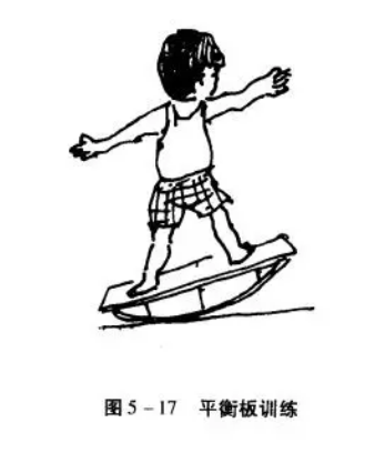①平衡板:利用平衡板进行训练,根据宝宝情况,让他站立在板上,跪在板上或坐在板上,当摇晃平衡板时,宝宝通过调节自己头部,躯干及四肢姿势和位置而不倒下,见图5-17.