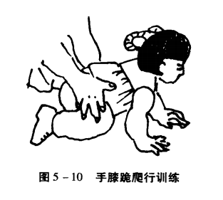 可根据不同情况在患儿上肢肩或下肢髋、腿适当维持。开始向前移动时,下肢自由运动差,家长可在孩子后面,用两手分别握住他的两踝部,当他伸出右手,可将左腿向前推;小儿伸出左手时,就将右腿向前推,要反复练习。