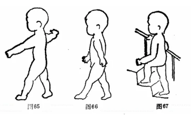 小儿由于肌张力增高,双脚尖负重。步行需别人帮助,臀部向后翘,四肢屈曲(图68)。