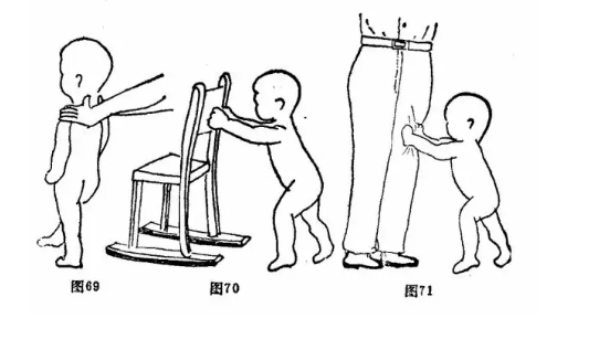 (2)利用器械,如家庭中的小竹车或床挡、桌子等辅助步行。让孩子扶住这些工具练习步行。姿势要求同上述(1)一样(图70)。